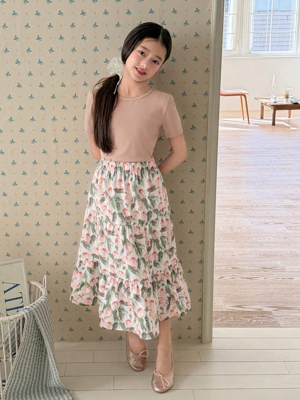 Tween Girls' Solid Color Crew Neck T-Shirt And Printed Elastic Waist Maxi Skirt Set Summer