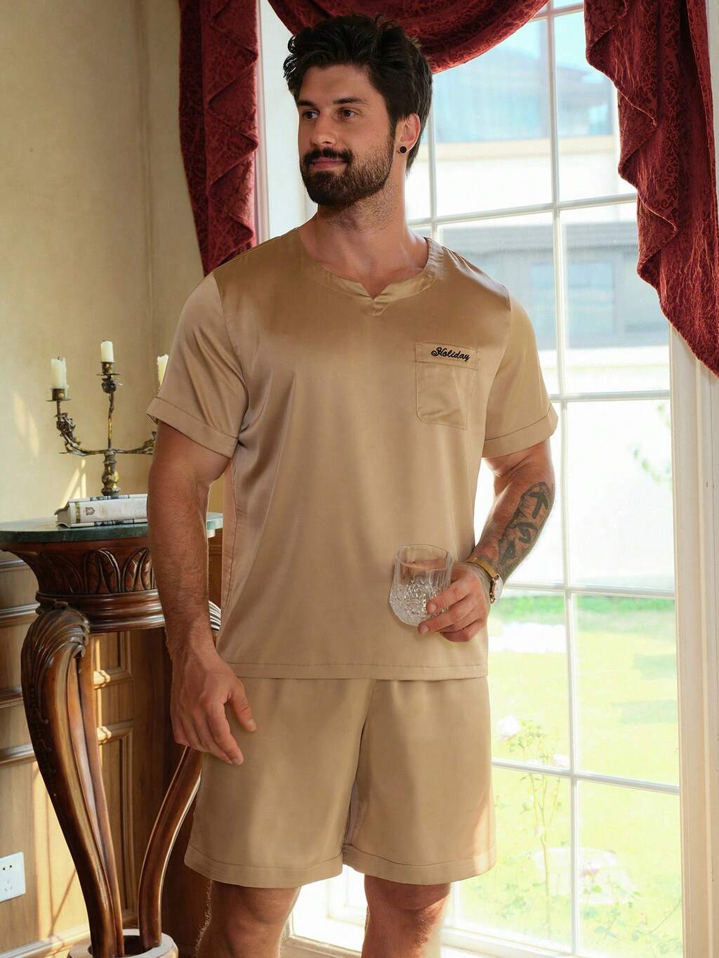 Men's Satin Fabric Shirt And Shorts Pajama Set, Summer