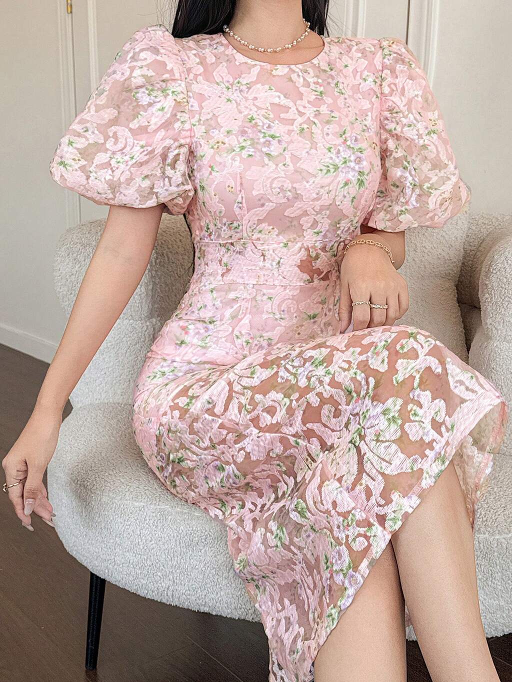 Women's Elegant Floral Puff Sleeve Dress, Summer Wedding Guest Dress Easter Sundress