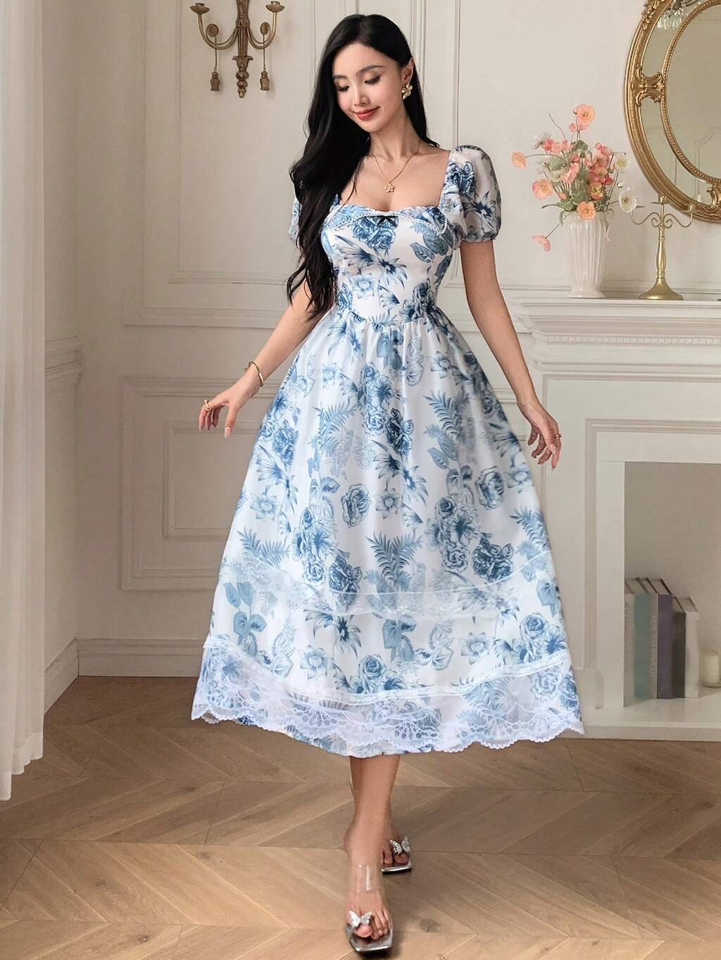 Women's Summer Vacation Floral Print Puff Sleeve Lace Panel Waist Midi Dress
