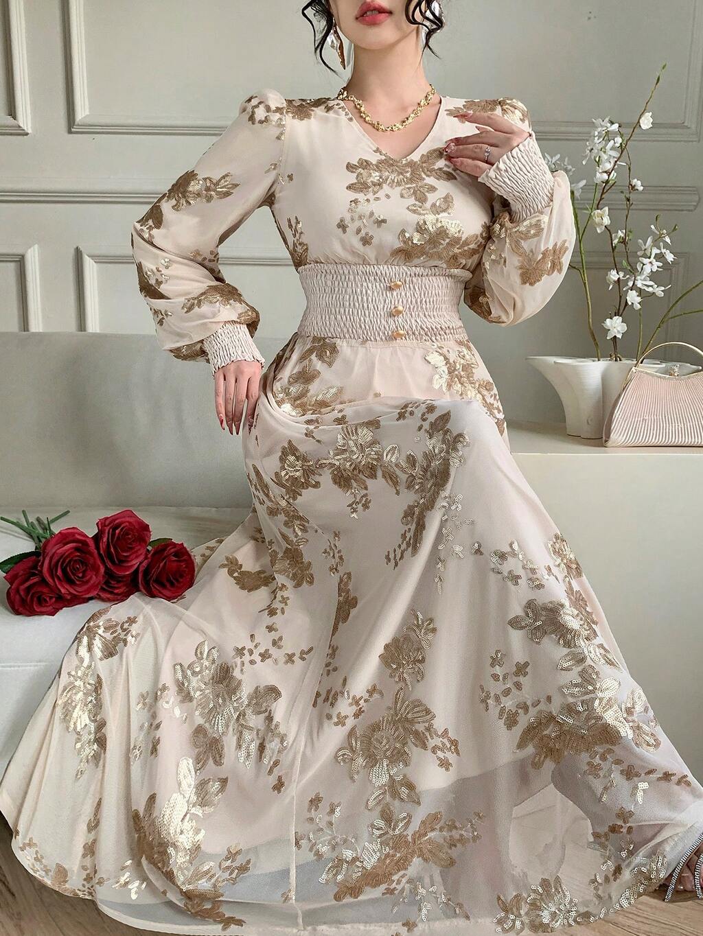 Sequin Floral Cabled Waist V-Neck Puff Sleeve Maxi Elegant Party Dress For Women, Spring/Summer Sundress