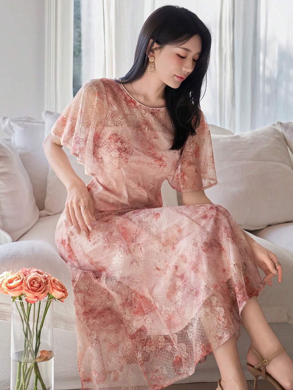 Women's Floral Ombre Ruched Chest Fluttering Sleeve Cinching Waist Dress, Elegant Vacation Style For Spring/Summer, Suitable For Dates And Occasions Sundress