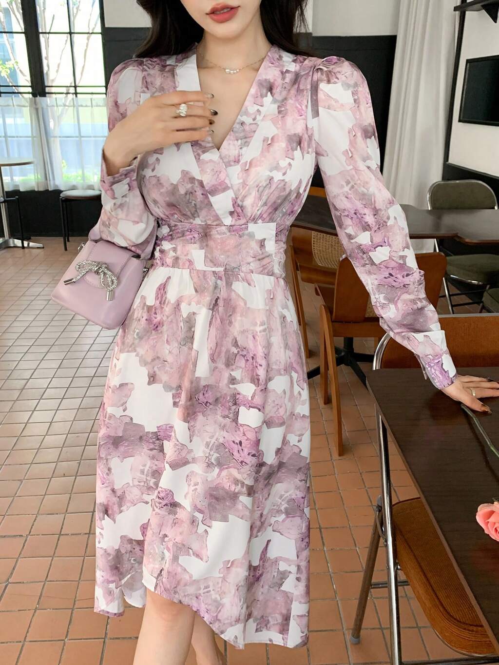Spring & Fall Women's Elegant Floral V-Neck Puff Sleeve Dress Long Sleeve Dress Maxi Dress