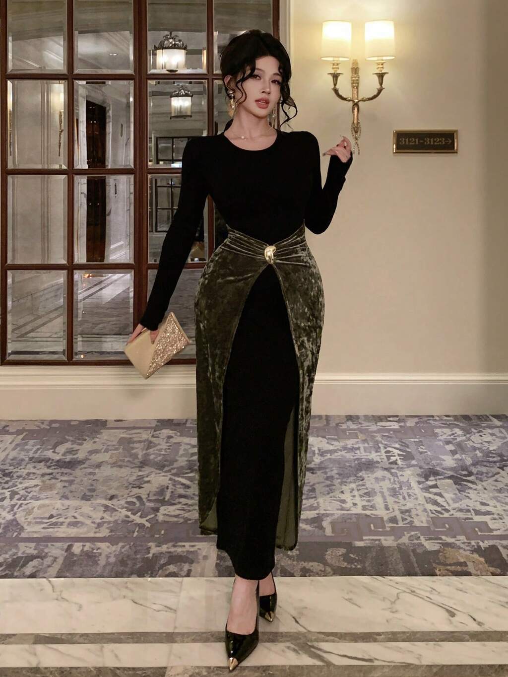 Elegant Black Velvet Metal Buckle Decor Shiny Black & Green Color Block Splice Dress, Suitable For New Year, Christmas, Wedding, Party, Formal Occasion, Fashion Fitted Midi Dress For Women Carnival Sparkly Dress