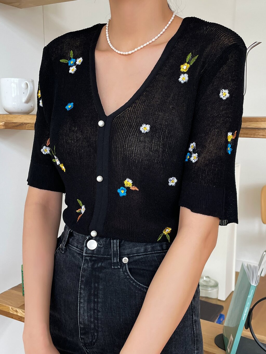 Floral Embroidery Pearls Front Knit Top
