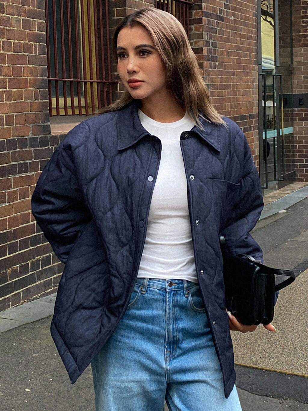 Solid Color Loose Quilted Thick V-Neck Long Sleeve Casual Street Wear Women Regular Jacket, Autumn/Winter Women Coats