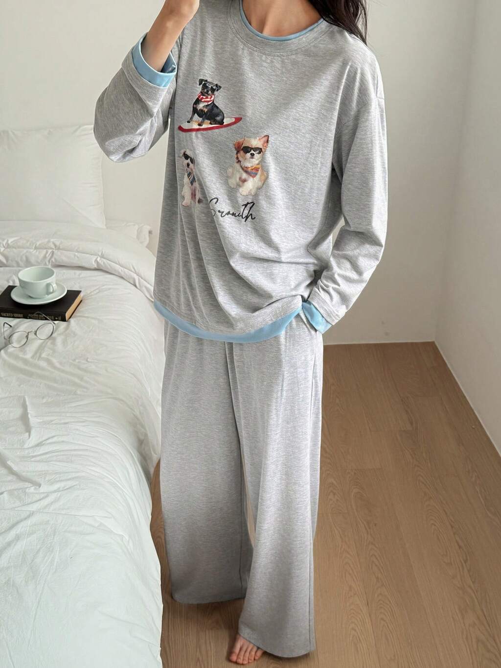 Cute Dog Print Contrast Color Patchwork Loose Women Pajama Set