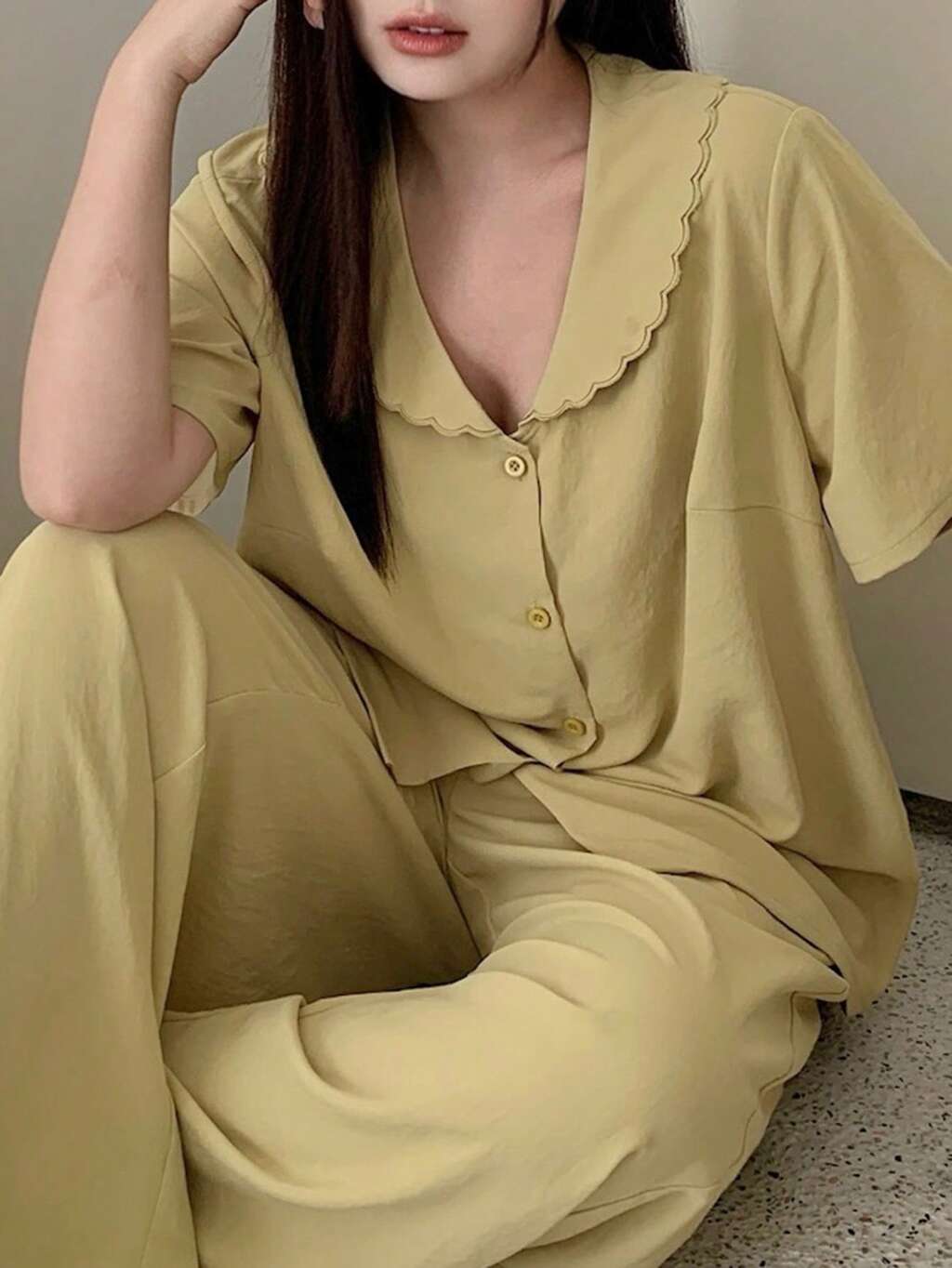 Dazy Plus Plus Size Women Solid Color Short Sleeve Single-Breasted Top And Pants Pajama Set