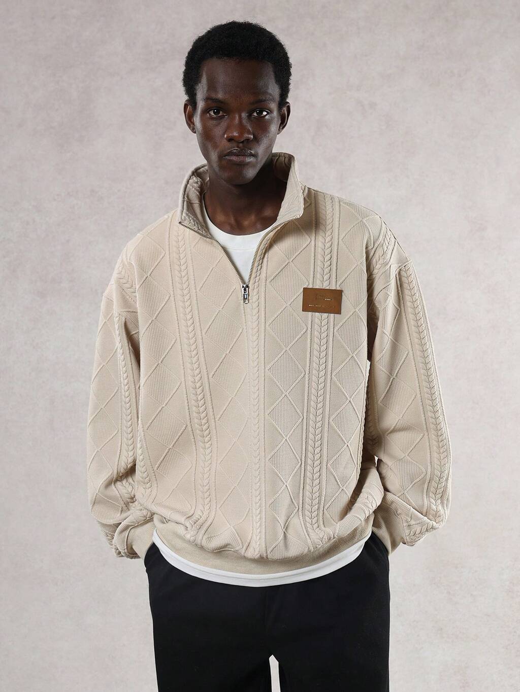 Textured Fabric Pullover Sweatshirt With Half-Zip Design For Men, Beige, Autumn