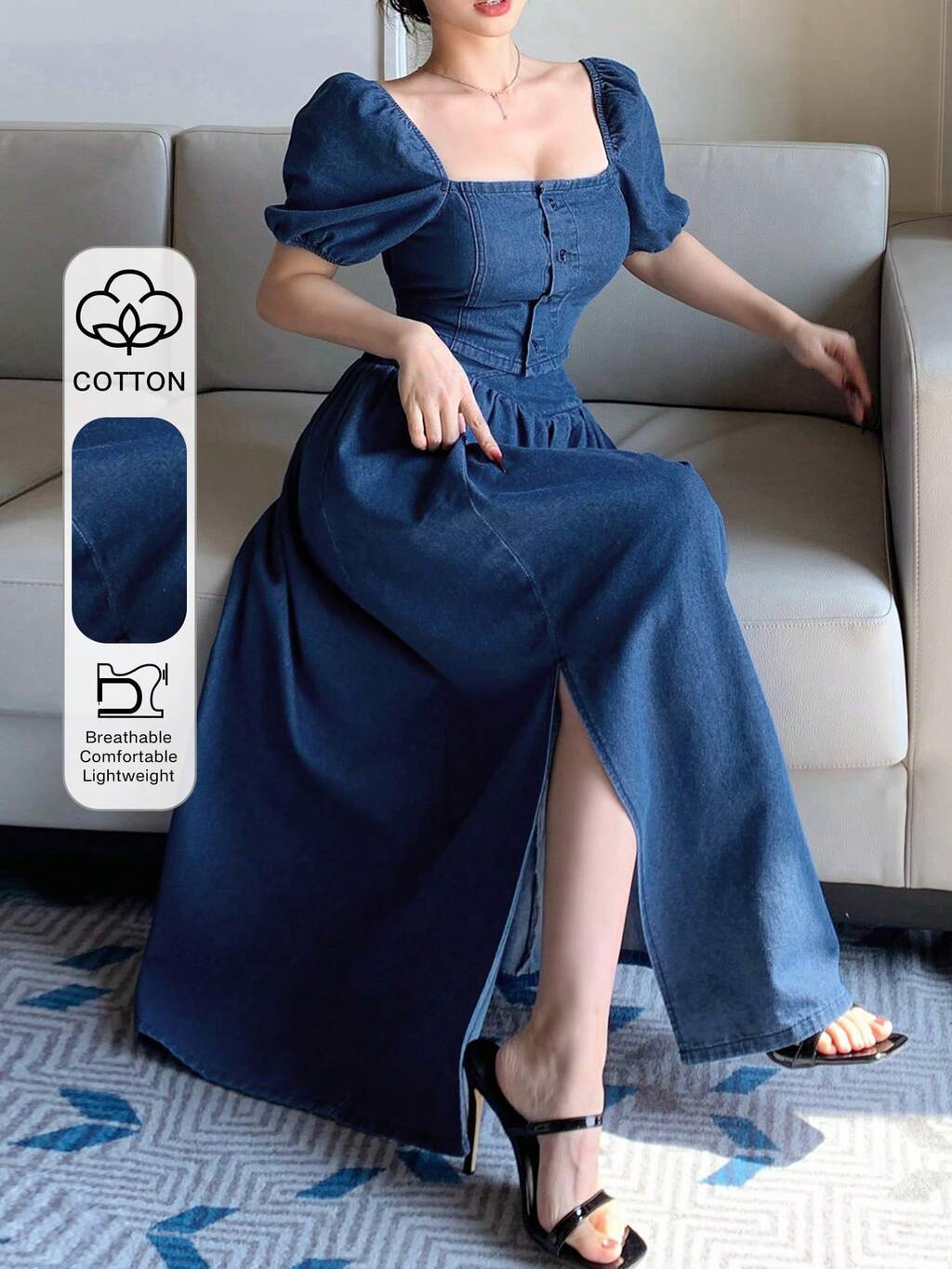 Puff Sleeve Crop Top And Denim Skirt Casual Vacation Outfit For Women