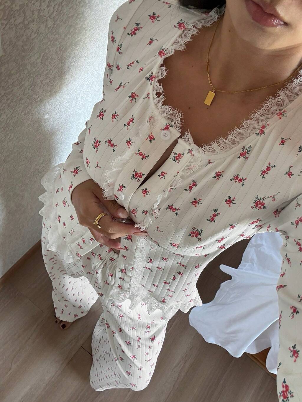 Floral Lace Ruffle Trim Women Pajama Set