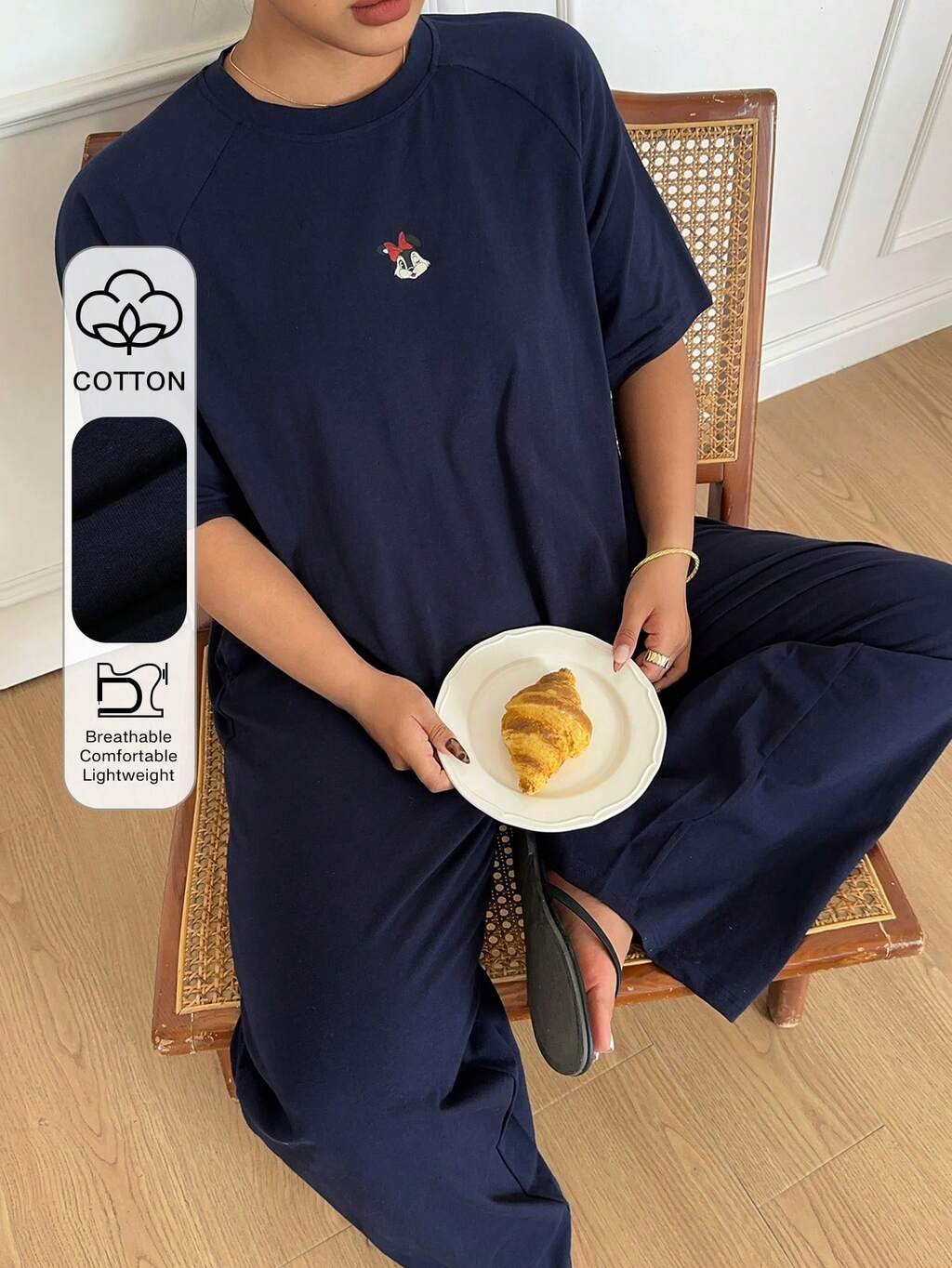 Dazy Plus Cute Cartoon Print Raglan Sleeve Loose Pajama Set, Comfortable Home Wear For Plus Size Women, Spring/Summer