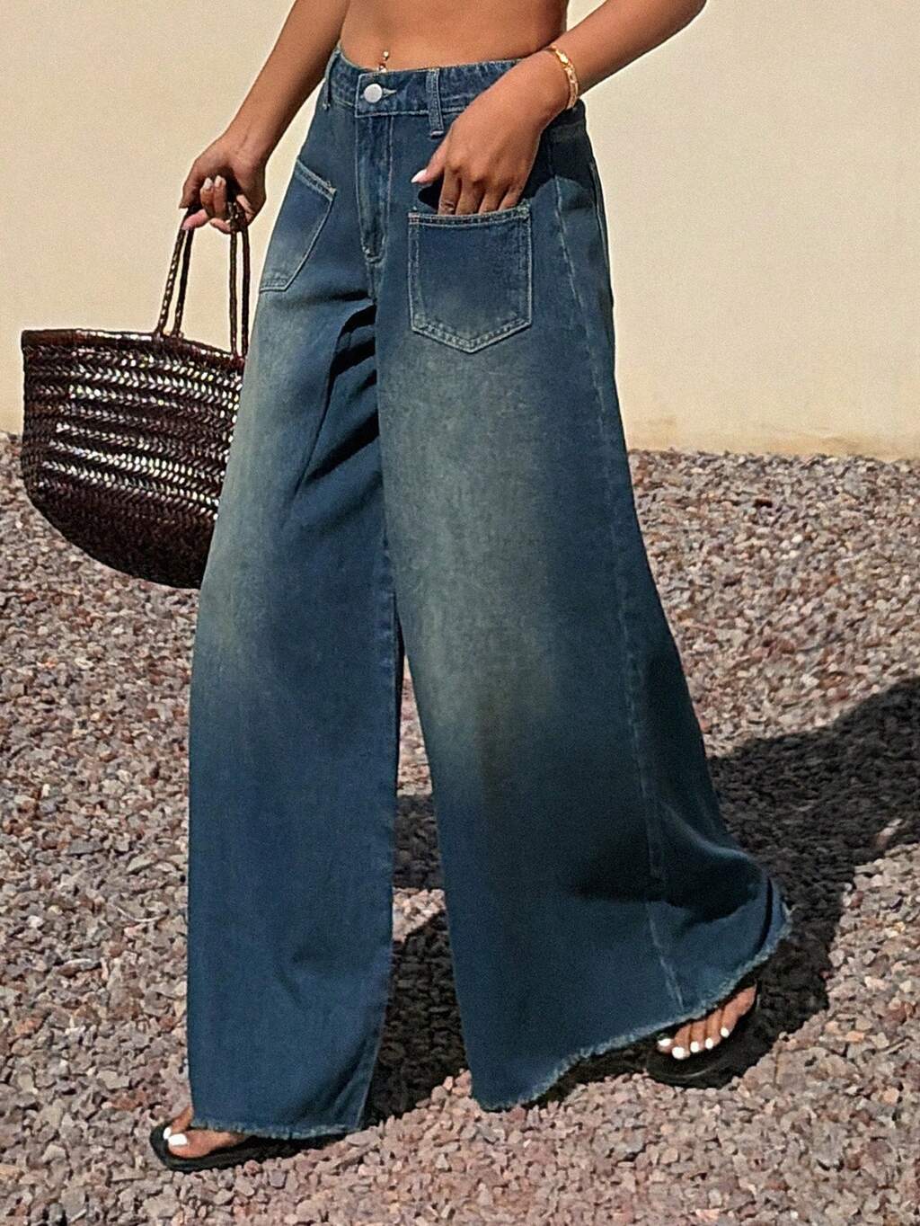 Vintage High Waist Frayed Hem Wide Leg Jeans, Women's Casual Denim Pants For Summer