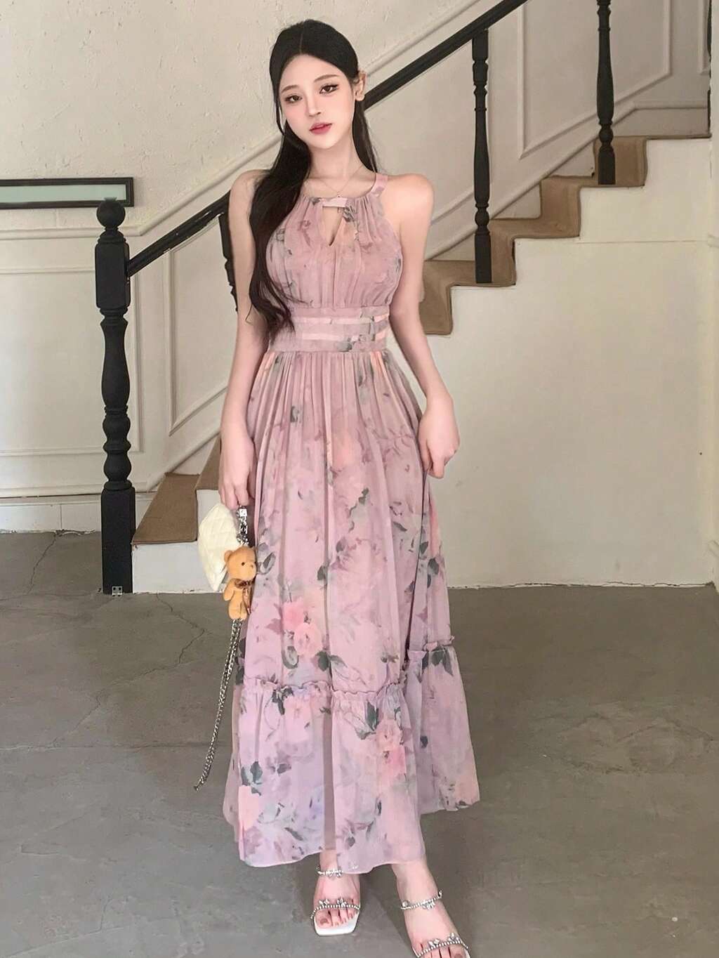 Women's Chiffon Floral Print Halter Neck Dress Summer Sundress Valentine's Day Easter