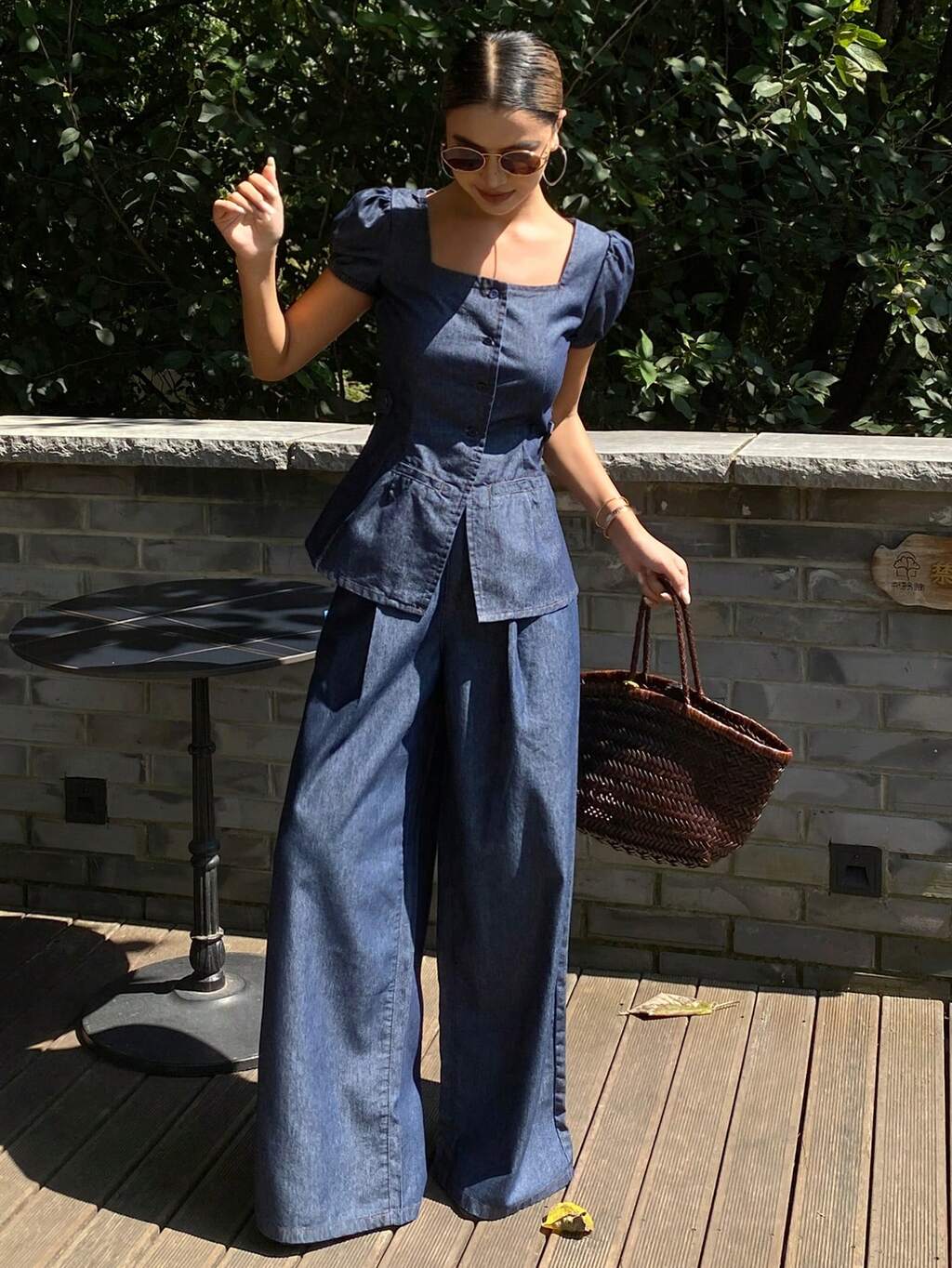 Women's Summer Square Neck Short Sleeve Denim Top And Straight Leg Jeans Casual Denim Set