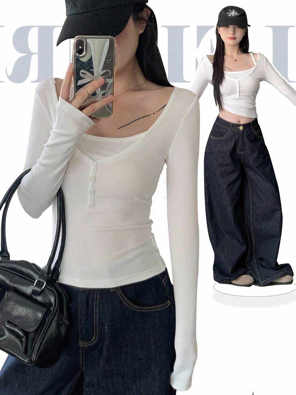 Women Solid Color Button Front Long Sleeve Fitted Casual T-Shirt, Autumn,Back To School Clothes Preppy Tops,Fall Women Clothes