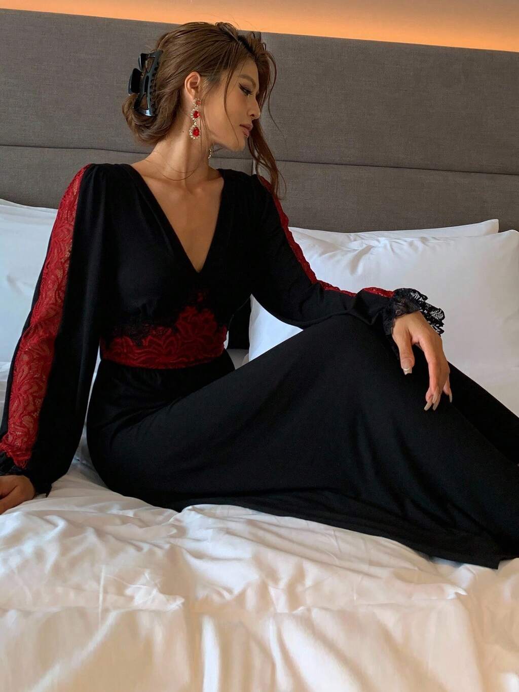 Charming Color Block Lace Patchwork Waist Cinched Long Women Nightgown Pajama, Winter