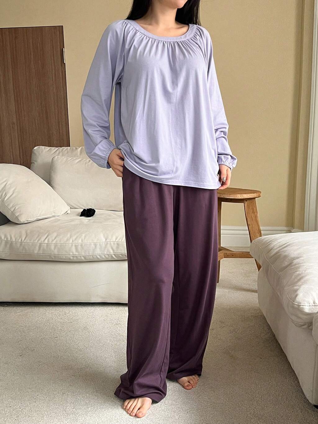 Minimalist Solid Color Fitted Top And Loose Pajama Pants Women Sleepwear Set