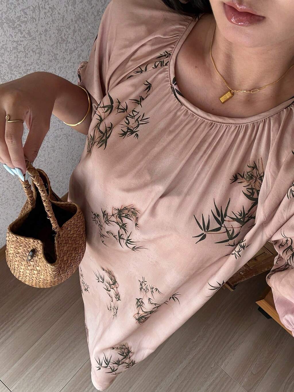 Elegant Bamboo Pattern All-Over Print Pleated Design Loose Women Nightgown