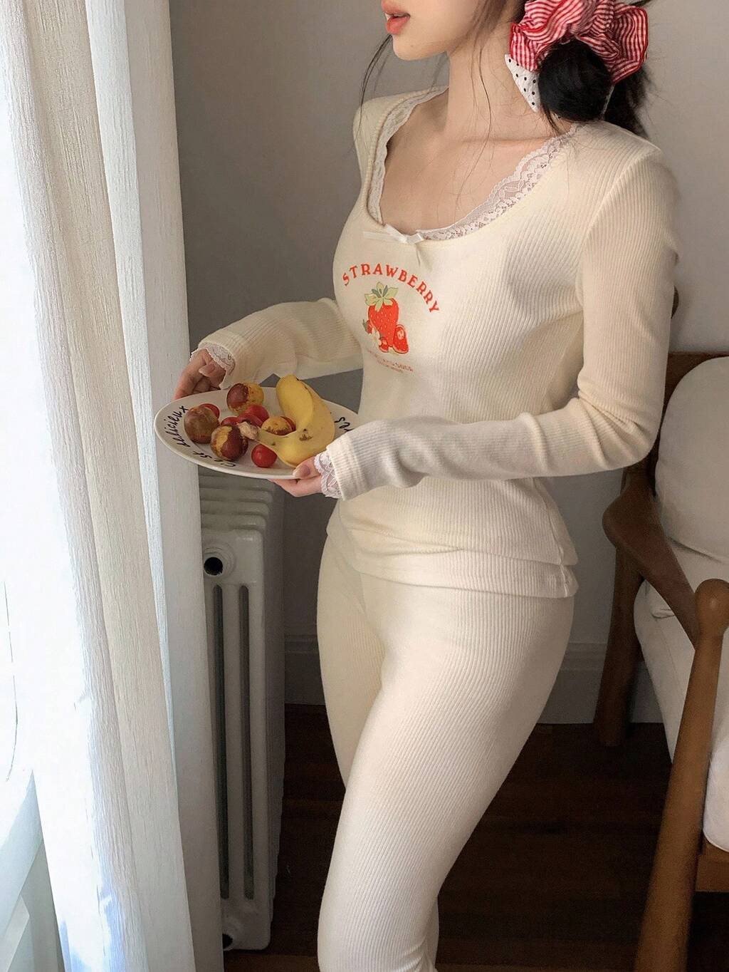 Women's Strawberry Print Lace Patchwork Slim Fit Thermal Underwear Set, Autumn/Winter Layering Pajama, Fall Clothes