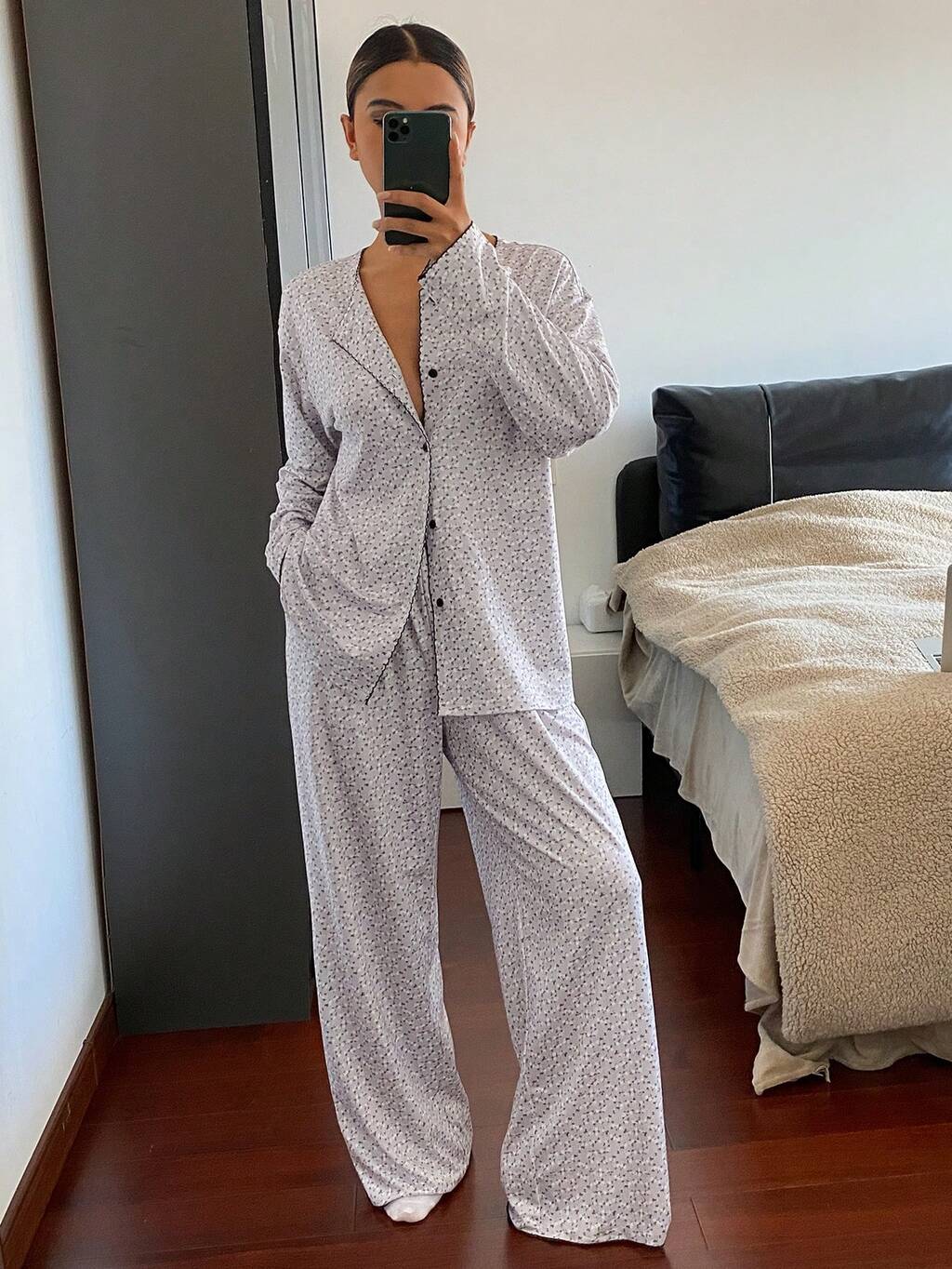 Ditsy Floral Ruffle Collar Loose Women Pajama Set