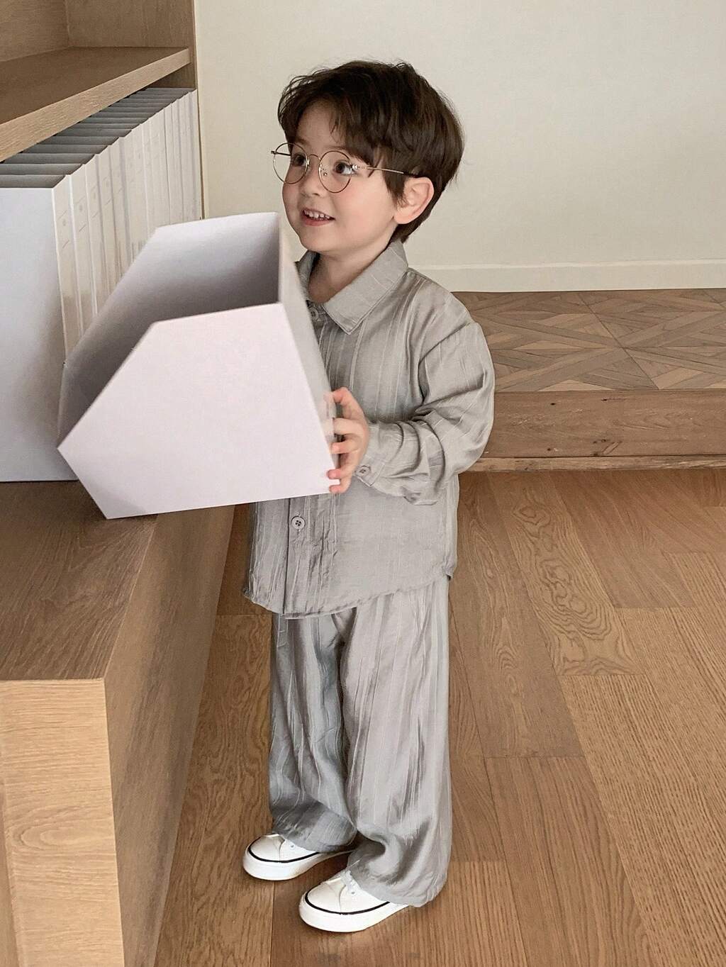 Toddler Boys' Fashion Shirt Set, Korean Style Casual Outfit, Grey, Lightweight Shirt Top And Wide Leg Pants 2-Piece Set, Spring/Summer/Autumn