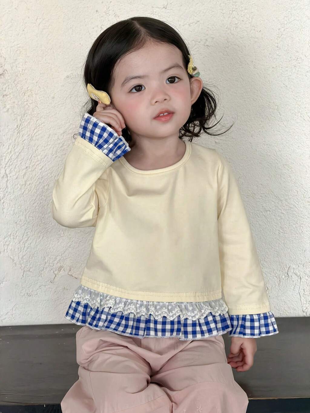 Baby Girls' Round Neck Tie-Up Plaid Patchwork Ruffle Trim Long Sleeve Top Spring Toddler Girls Clothes