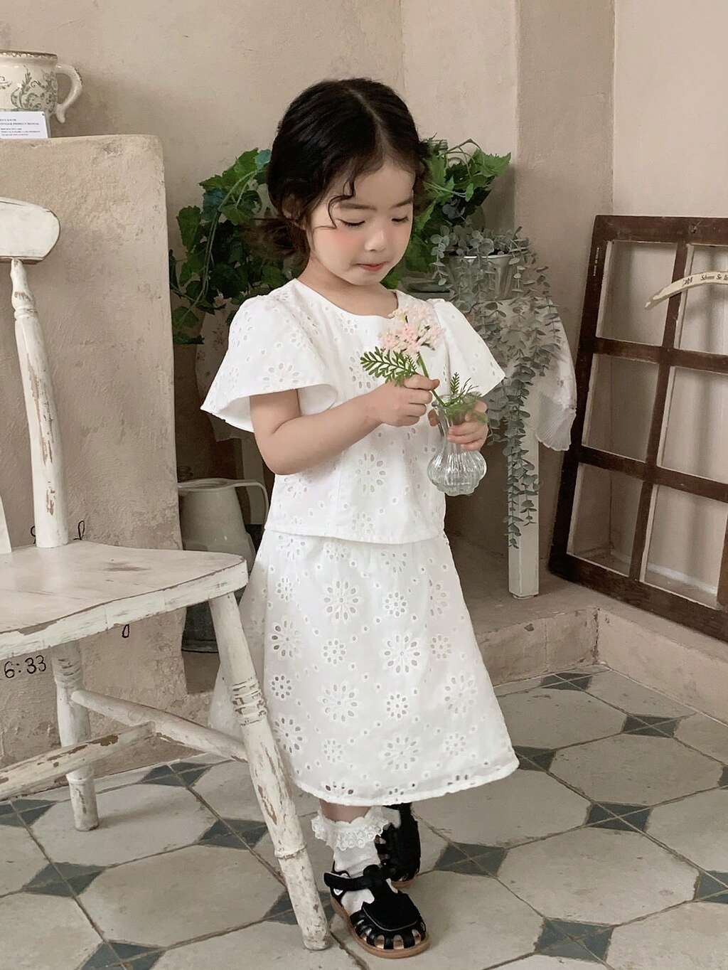 Toddler Girls' Round Neck Lace Short Sleeve Shirt & Skirt 2-Piece Set