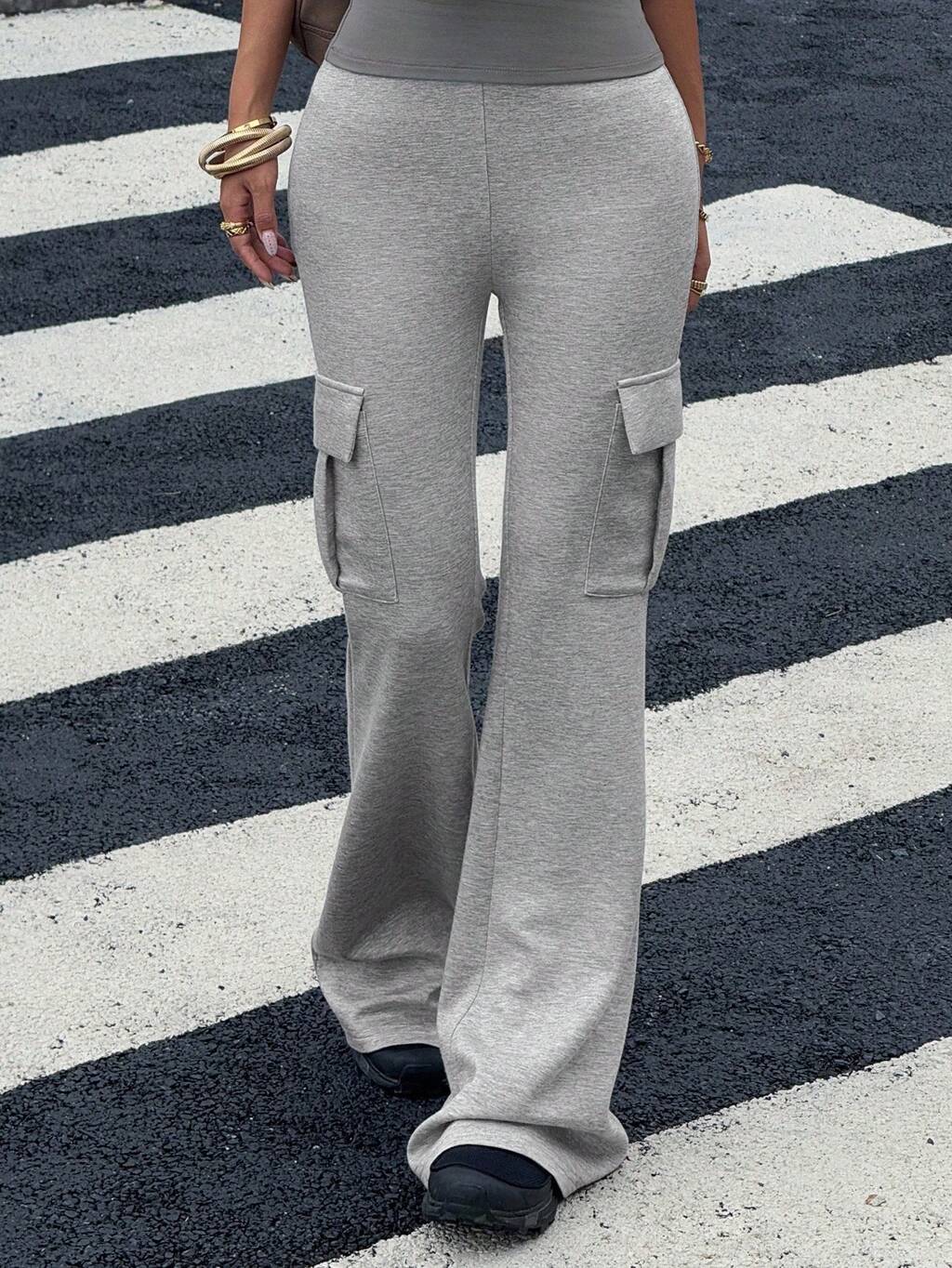 Women's Solid Color Flare Leg Pants With Big Pockets, Casual Sports Trousers