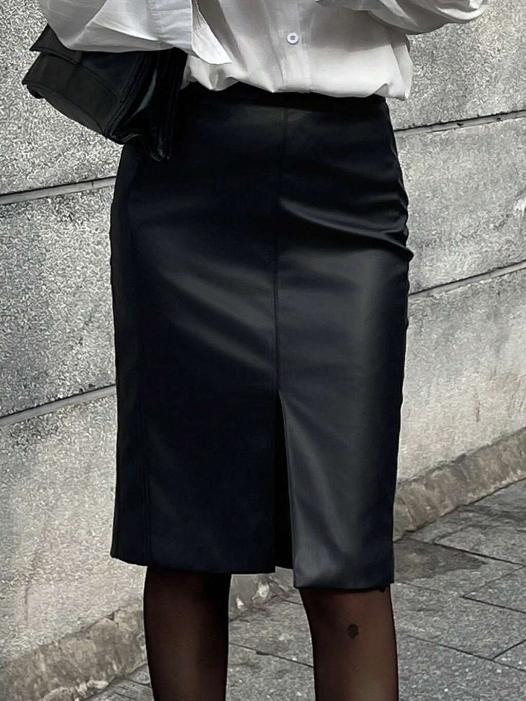 Women's Solid Color PU Leather Slit Hem Elegant Pencil Skirt