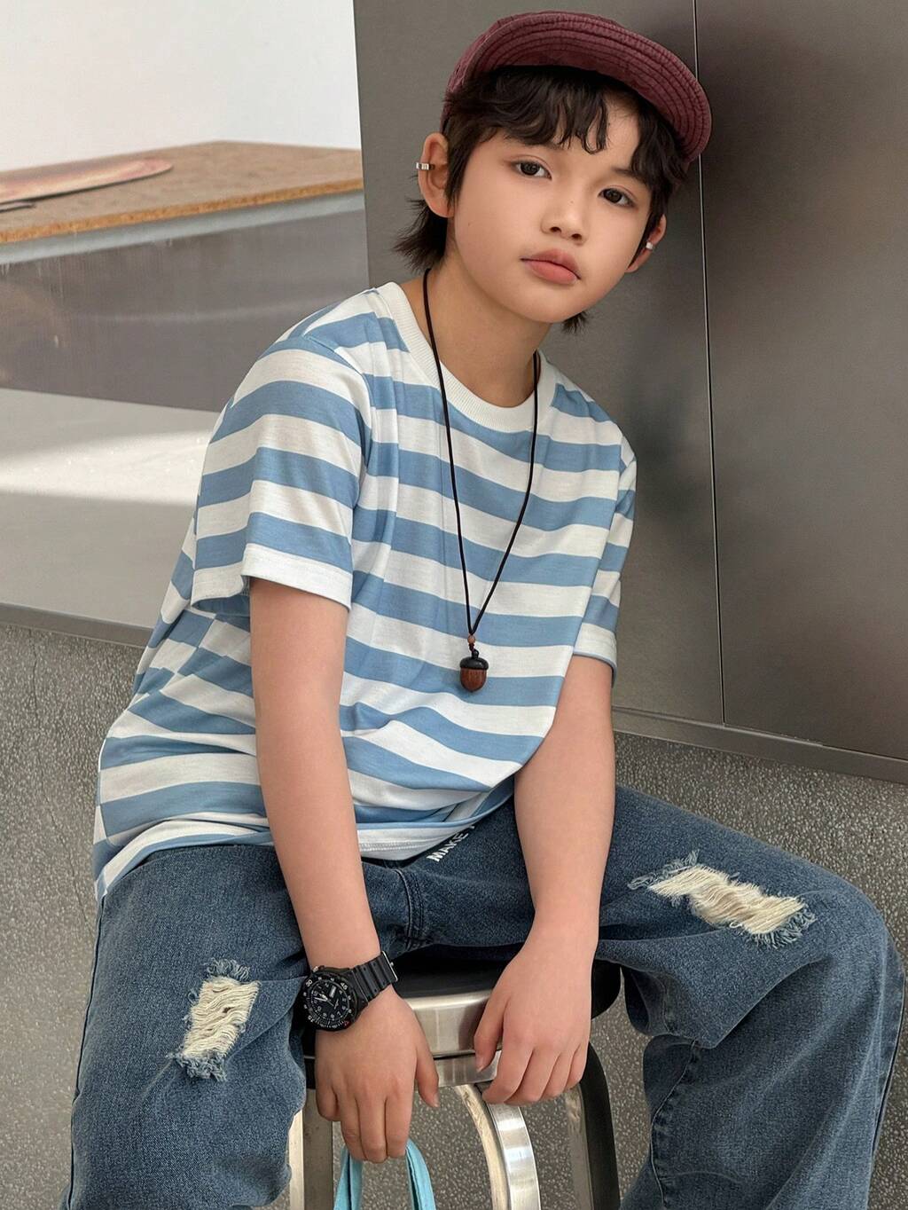 Tween Boy Striped Crew Neck Short Sleeve Casual Loose Versatile T-Shirt Summer