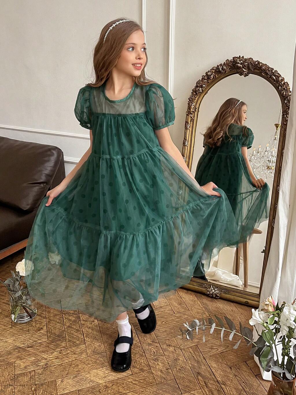Sukienka z siateczki w groszki z okrągłym dekoltem i krótkim rękawem dla nastolatek na lato