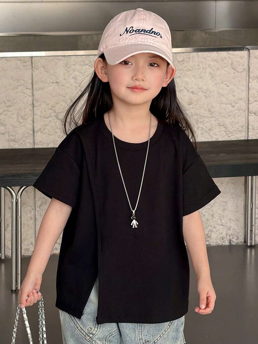 Young Girls Casual Round Neck Split Hem Short Sleeve T-Shirt, Summer Spring
