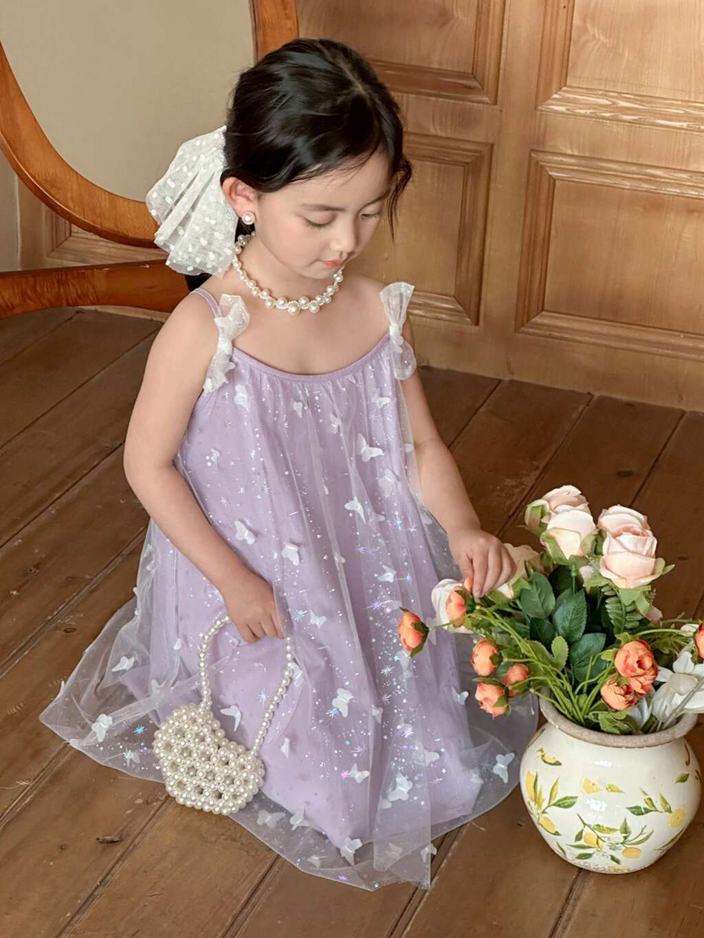 Tween Girl Pearl Decor Round Neck Bow Shoulder Decor Sleeveless Dress
