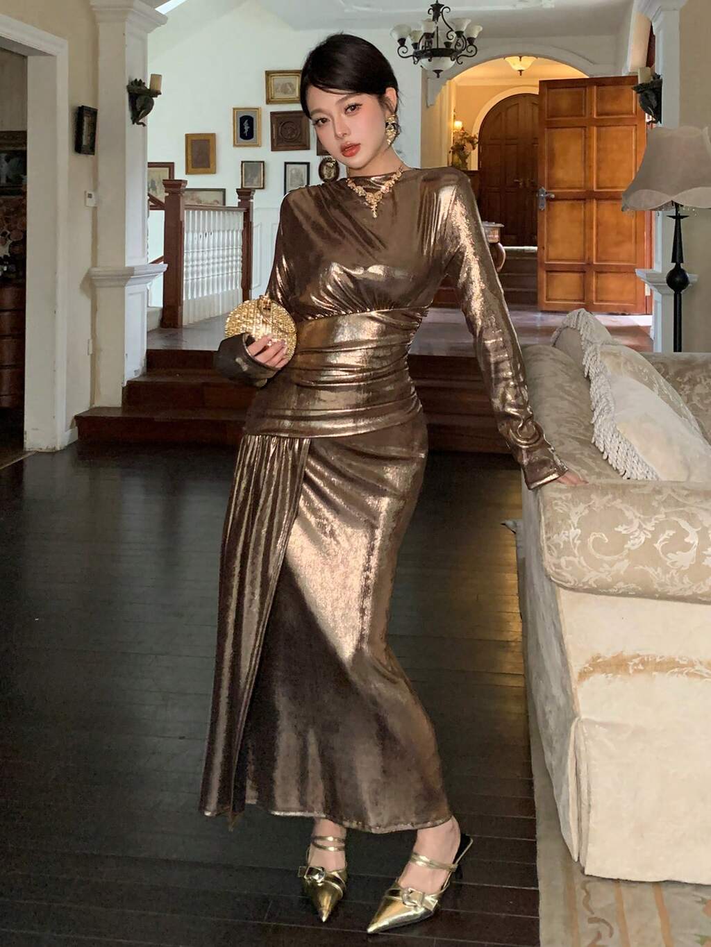 Women's Elegant Solid Color Glossy Pleated Mid-Length Dress, Autumn