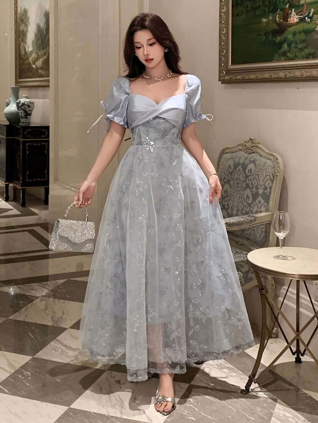 Women's Elegant Sequin Embroidered Patchwork Mid-Length Dress, Summer,Wedding Guest Dress Women Sundress