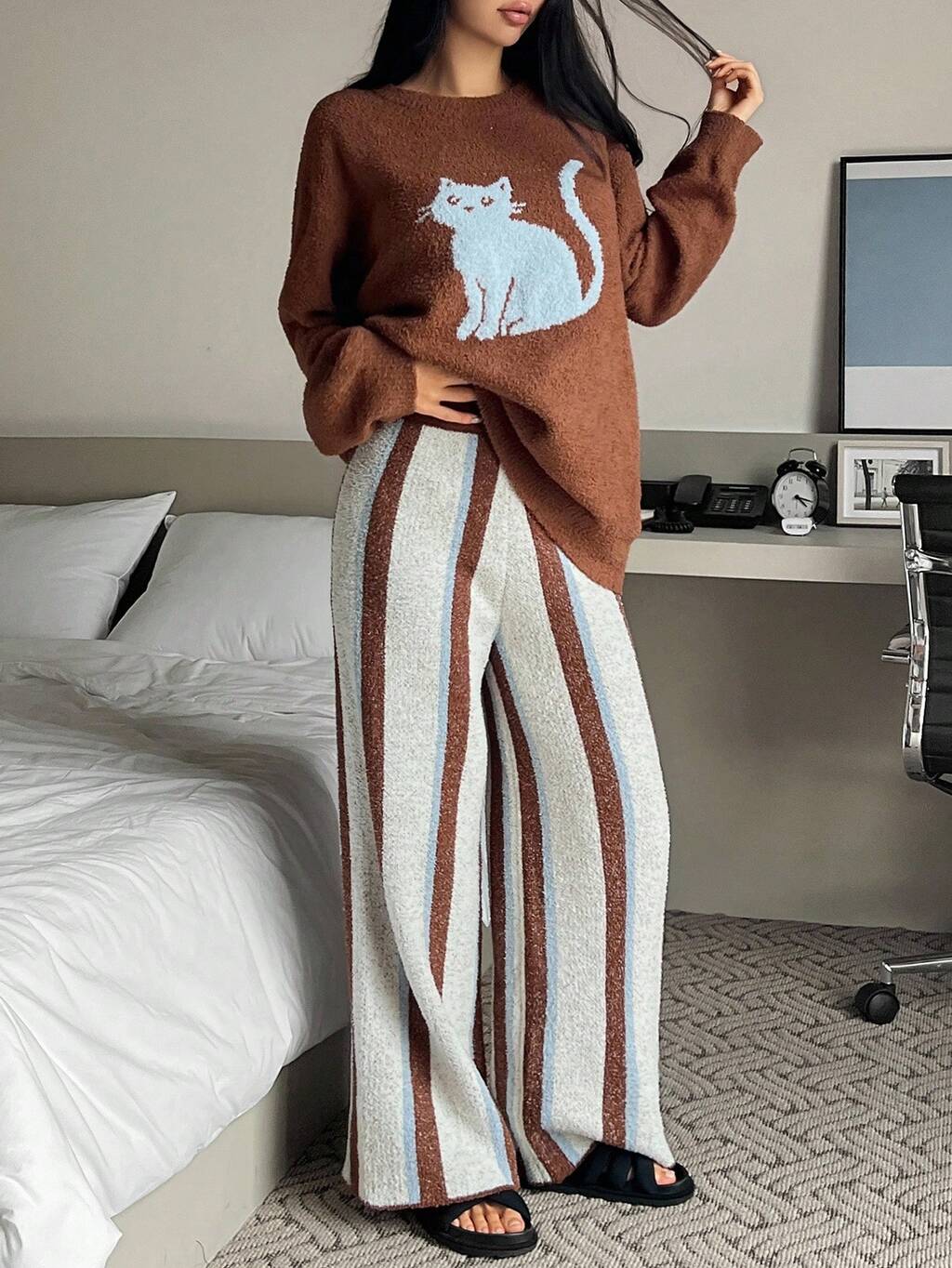 2pcs Women Cat & Striped Pattern Loose Long Sleeve Knit Pajama Set, Autumn/Winter, Fall Clothes