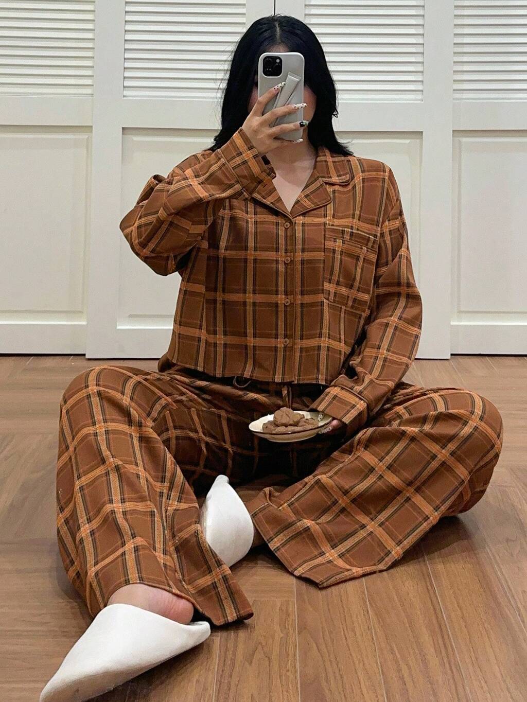 Dazy Plus 2pcs Plaid Loose Fit Casual Pajama Set, Suitable For Outdoor Wear, Plus Size Women, Spring/Autumn, Cozy Outfit, Fall Winter Clothes