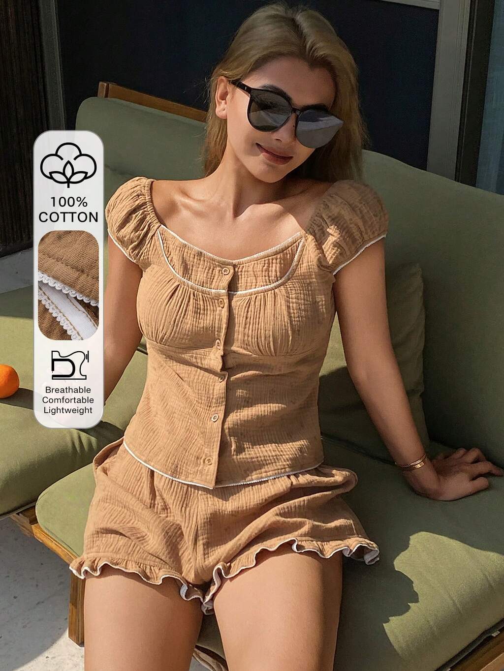 Vacation Style Satin Ruffle Trim Loose Raglan Sleeve Top & Shorts Pajama Set For Women