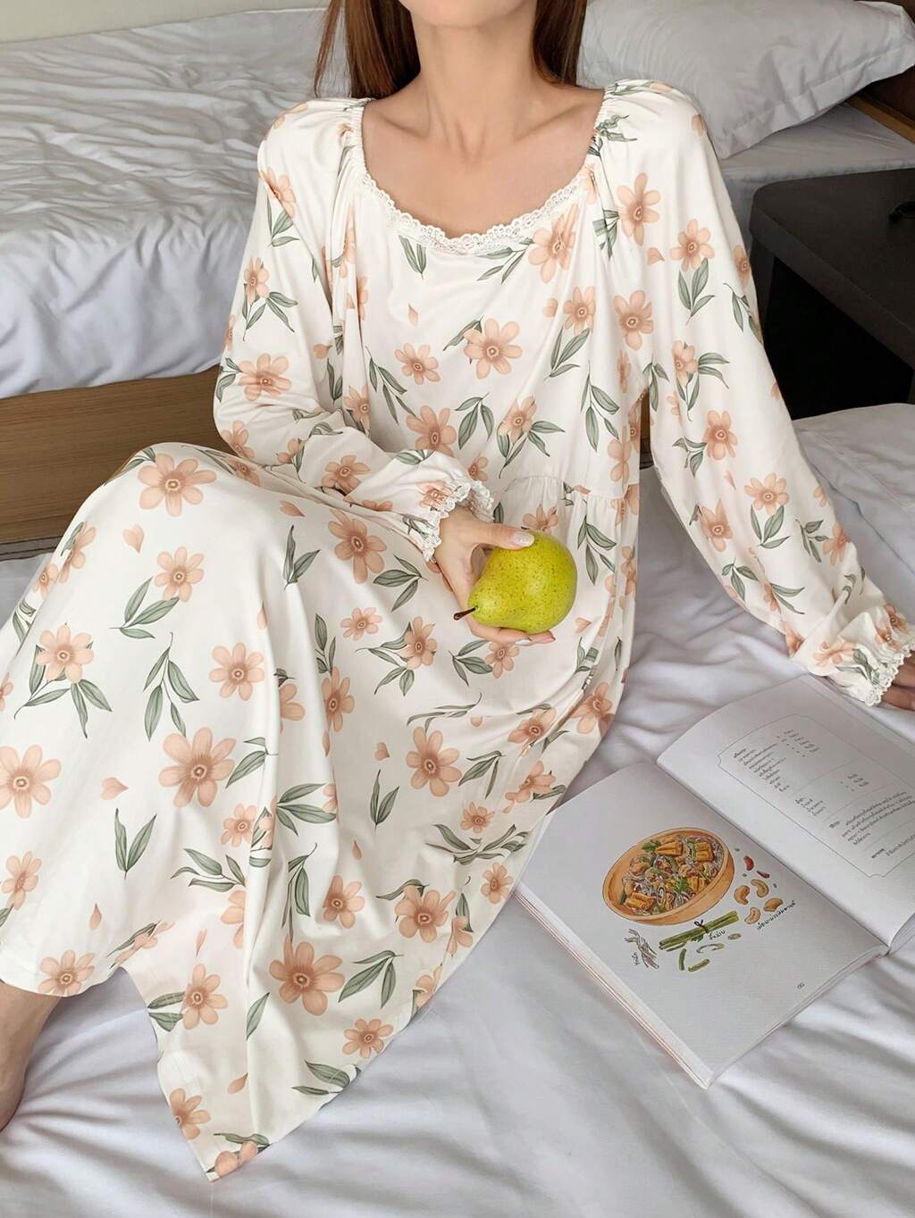 Floral Allover Print Sweet Square Collar Frilled Hem Nightgown Pajama
