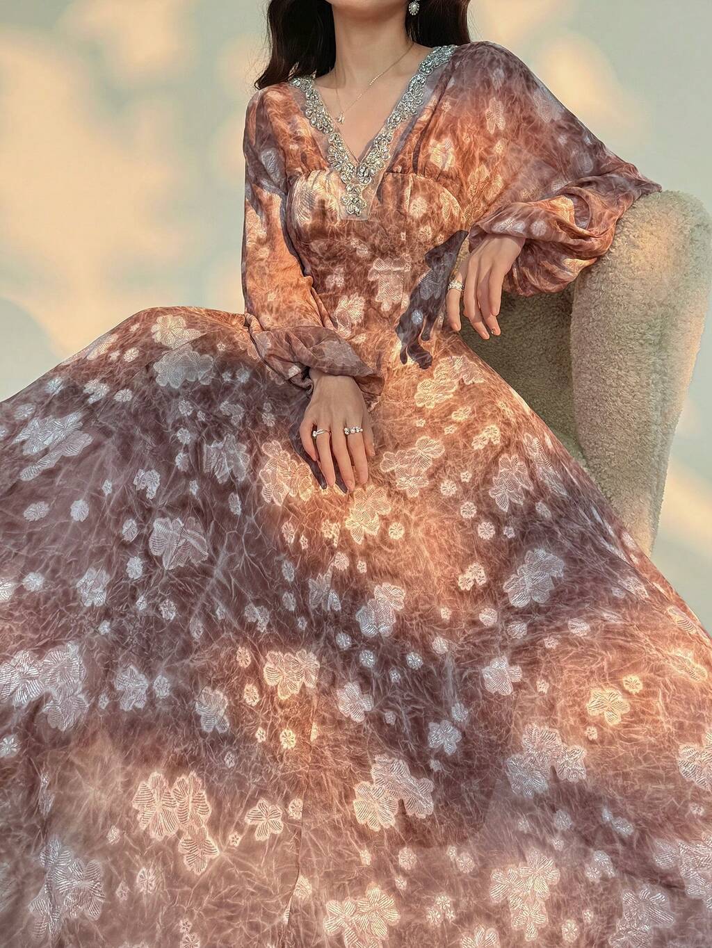 Women's Elegant Floral Print V-Neck Lantern Sleeve Waist Cinched Long Dress, Suitable For Party And Banquet, Spring/Autumn
