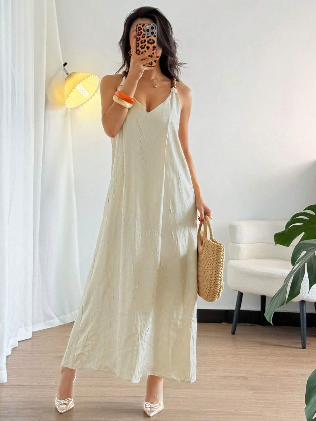Women's Loose V-Neck Bead Decor Mid-Length Casual Dress, Summer Maxi Dress