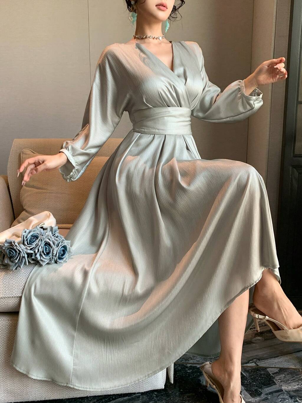 Spring & Summer Shiny Sequin Green Flare Sleeve Scarf Collar Satin Patchwork Dress, Elegant For Valentine's Day, Wedding, Party, Formal Occasion, Fashion Event, Commute, Maxi Length Long Sleeve Dress For Women Sundress