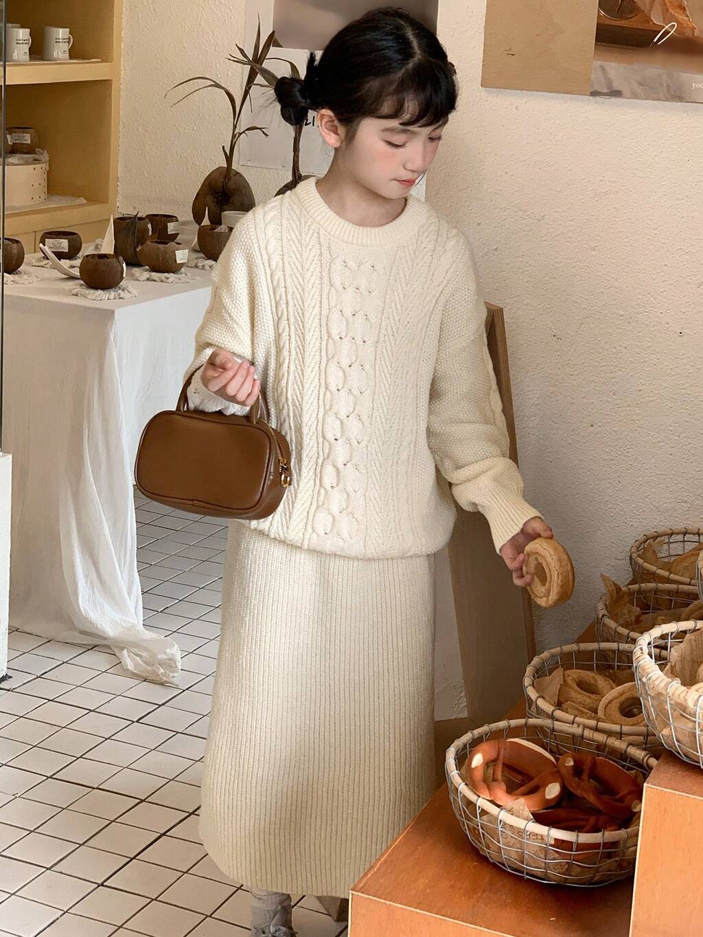 Tween-Mädchen 2-teiliges Strick-Outfit mit Rundhalsausschnitt, Größe L, Herbst, Winter