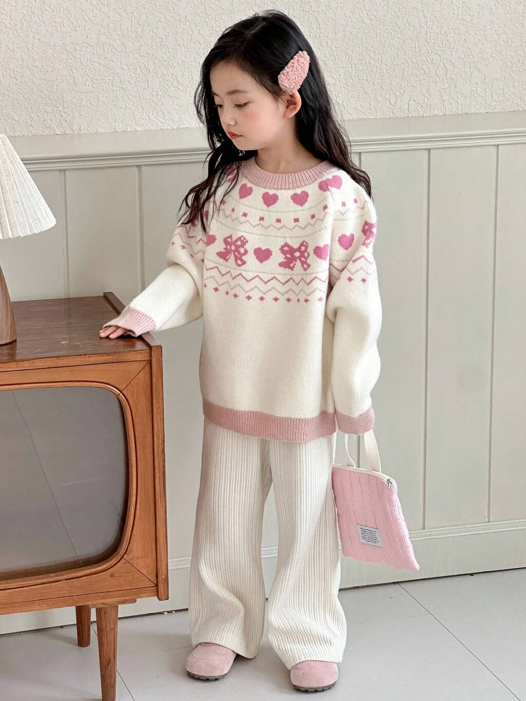 Girls' Fashion Heart & Bow Decor Crew Neck Sweater, Autumn/Winter