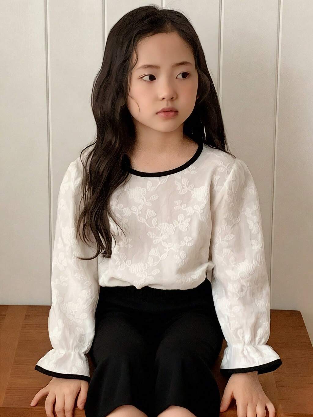 Young Girls Textured Floral Casual Colorblock Round Neck Long Sleeve Shirt, Spring/Autumn
