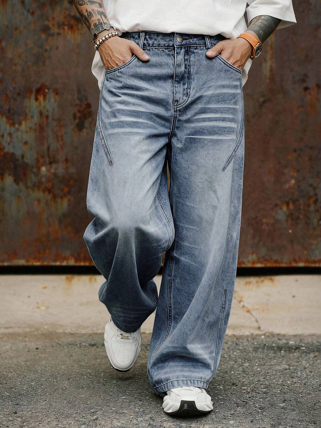 Men's Loose Fit Wide Leg Washed Jeans, Solid Color, Autumn
