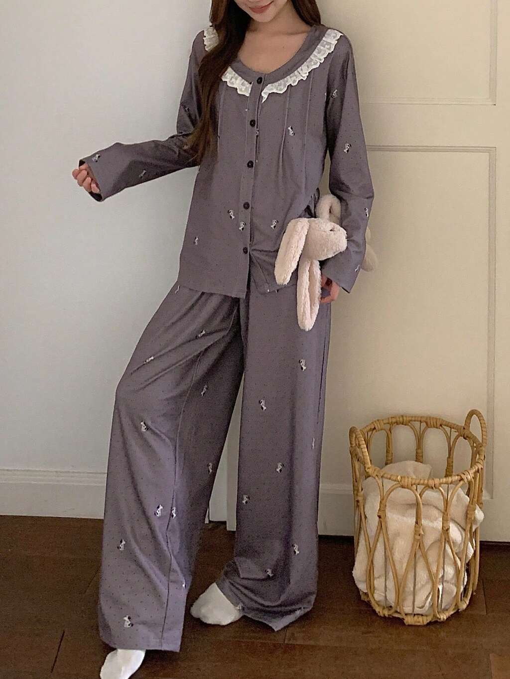 Damski komplet piżamowy z uroczym szczeniaczkiem, nadrukiem w kropki, kontrastowym haftem i koronką