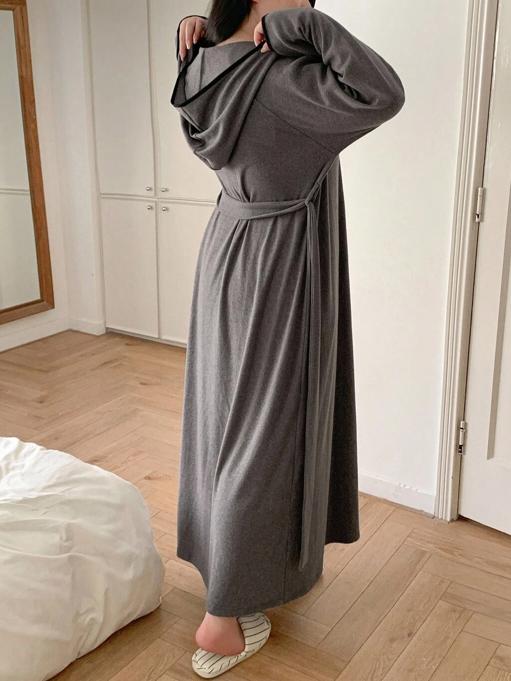 Letter Print Hem Slit Loose Long Dress Nightgown For Women Pajama, Cozy Outfit, Fall & Winter, Moo Moo Night Dress