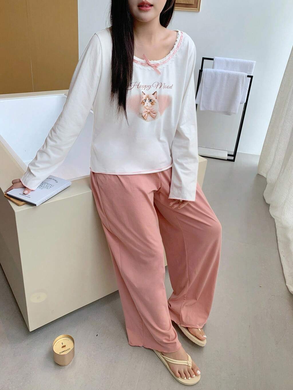 Simple Solid Color Frill Trim Women's Loungewear Set